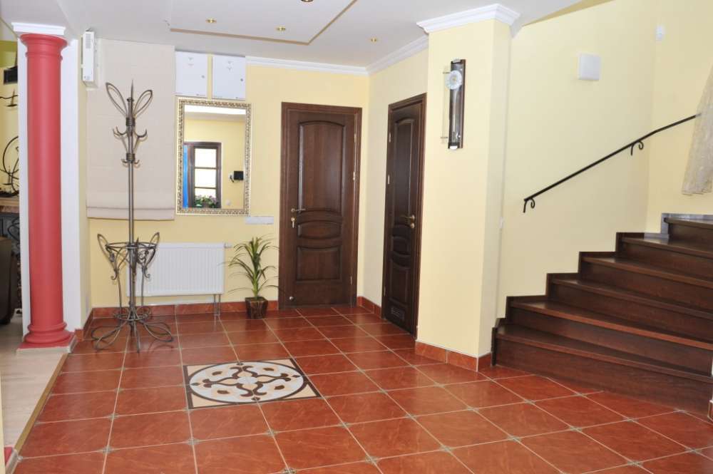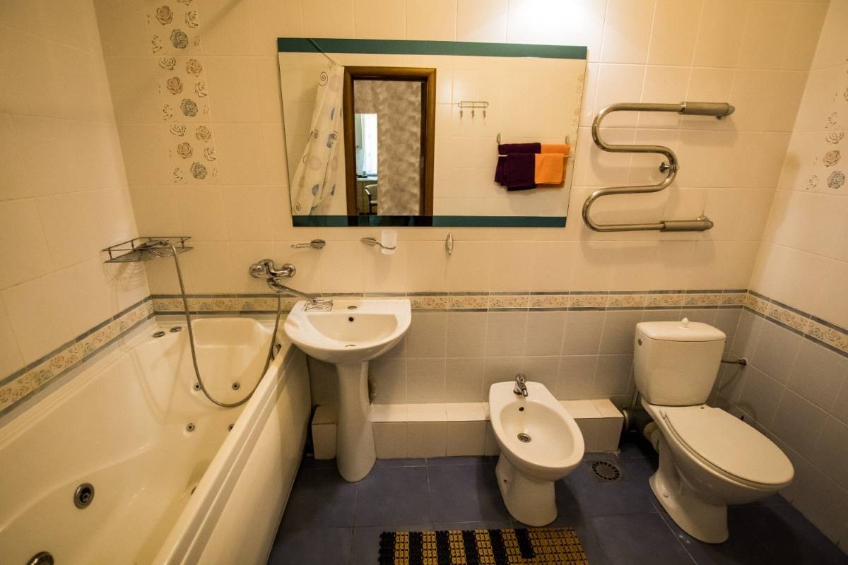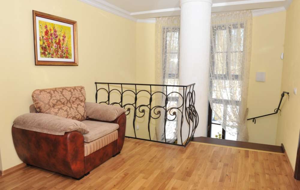На кухне есть плита, духовой шкаф, СВЧ-печь, холодильник, кофе-машина, набор посуды. Санузлы: на первом этаже - два санузла с умывальником и туалетом, на втором - два санузла с умывальником и туалетом, душевой кабиной, биде, феном, полотенцами, халатами, тапочками и умывальными принадлежностями. На втором этаже расположена спальная комната с двухспальной кроватью, телевизором, кондиционером и кабинет с диваном, компьютером, телевизором, телефоном и возможностью выхода в интернет.